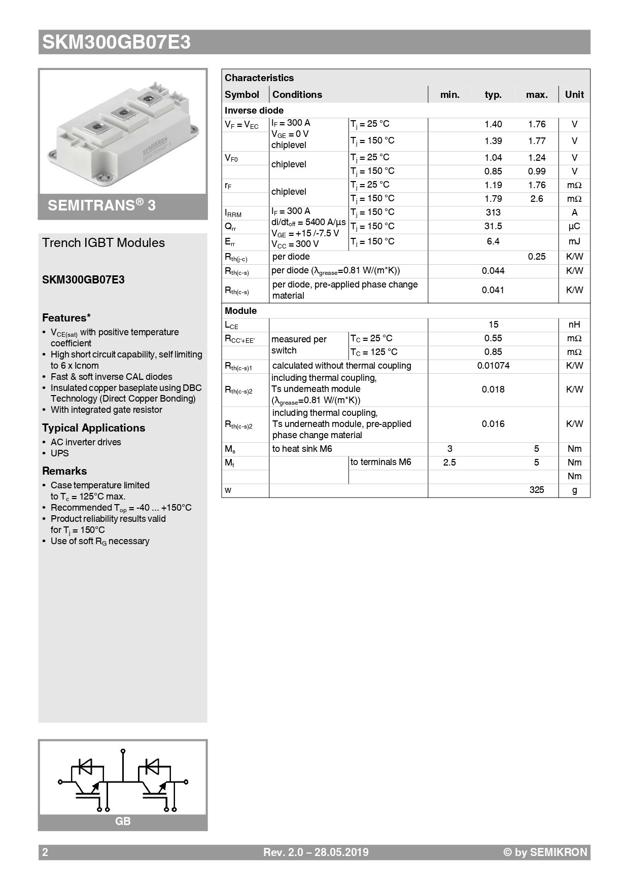 Mã sản phẩm: SKM300GB07E3 Điện thế: 650V Dòng tải: 300A Công nghệ: IGBT 3 (rãnh)