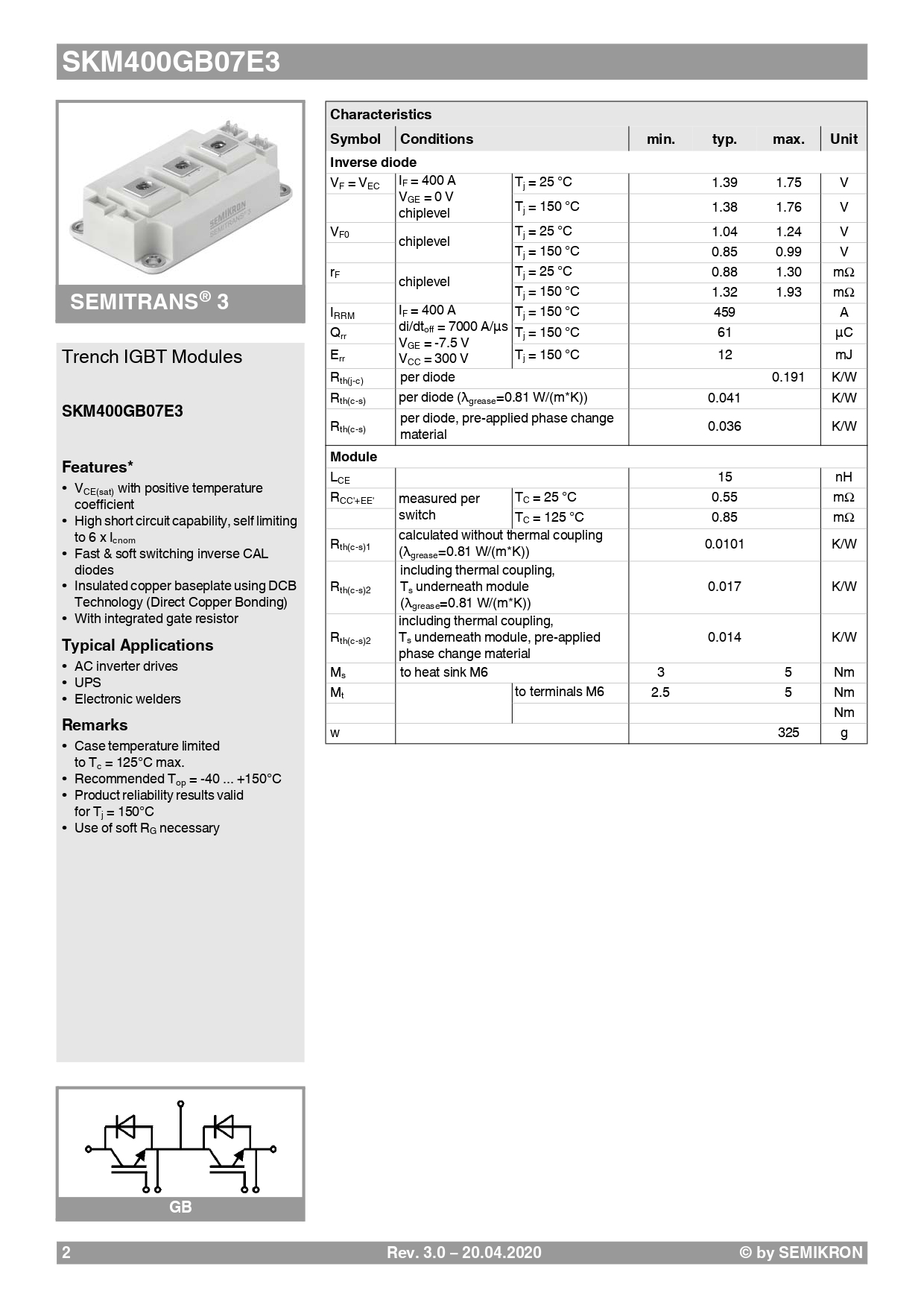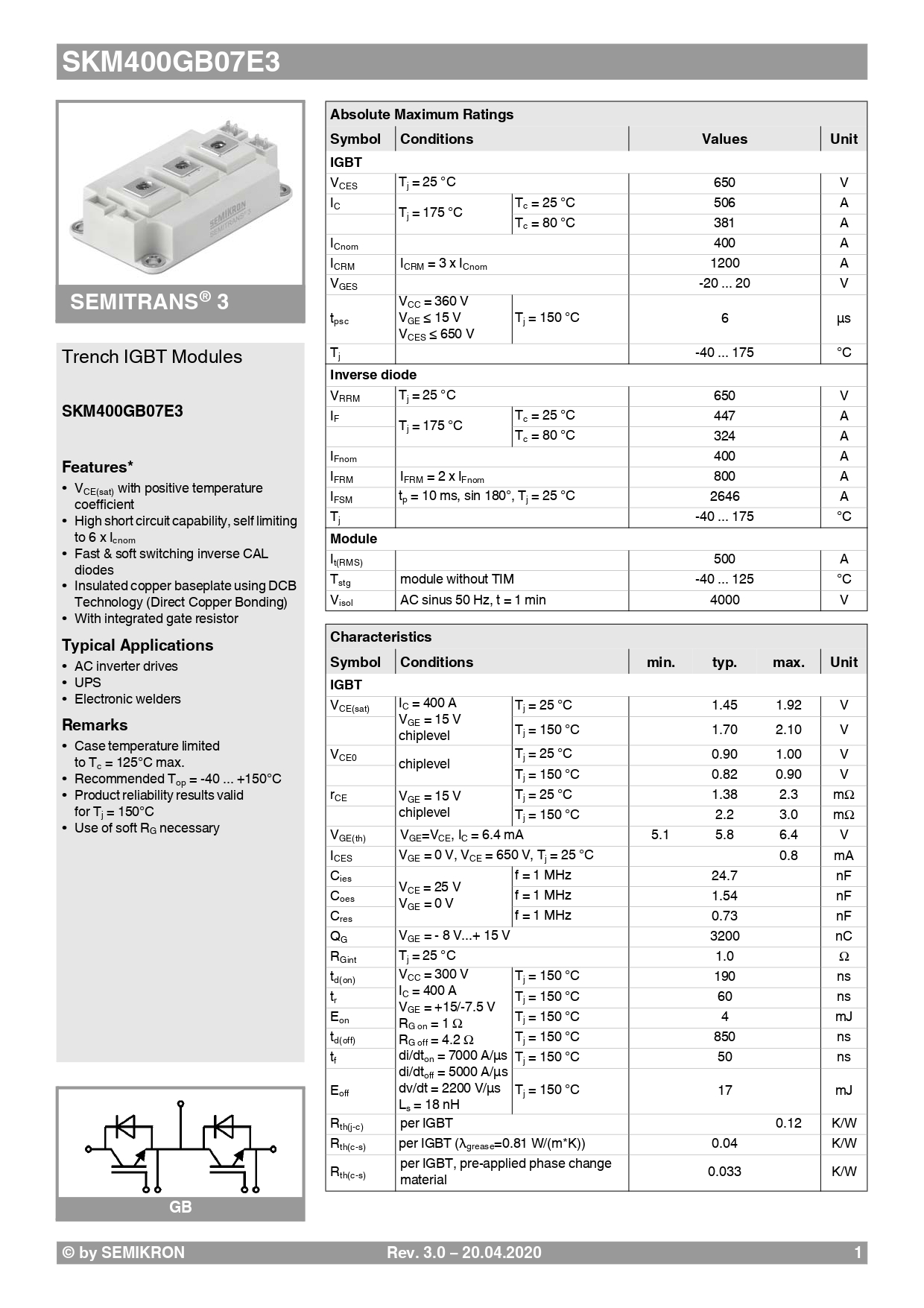 Mã sản phẩm: SKM400GB07E3 Điện thế: 650V Dòng tải: 400A Công nghệ: IGBT 3 (rãnh)