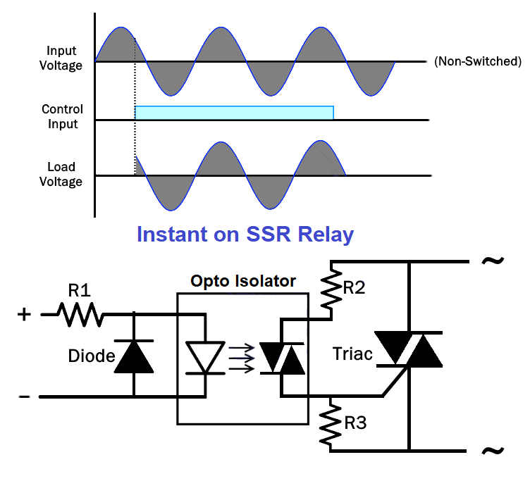 Là thiết bị chuyển mạch ngay khi nhận tín hiệu ON rơ le cho phép tải được bật hoặc tắt tại bất kỳ điểm nào. Độ trễ này thường nằm trong khoảng ms (mili giây)
